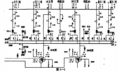 1.1一次主接線。圖1-1所示為220KV仿真綜合站的一次系統主接線圖,220KV仿真站內有兩臺三相三繞組有載調壓變壓器,有三個電壓等級220KV、110KV、35KV,接線組別為YO/Y0/A,冷卻系統為強迫油循環風冷系統。220KV系統為雙母帶旁母接線運行,共有4回線路,有獨立的母聯斷路器和旁路斷路器。110KV系統為雙母帶旁母接線運行,共有7條線路,有獨立的母聯斷路器和旁路斷路器。35KV系統為雙母帶旁母接線運行,共有10條線路,有獨立的母聯斷路器和旁路斷路器。