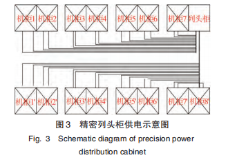 方案2:如果采用傳統(tǒng)的精密列頭柜配電方案,則需為兩列機柜配置1個精密列頭柜,并向每面機柜提供雙電源供電。如圖3所示。