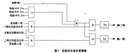 若母聯開關和母聯TA之間產生故障,斷路器側母線槽跳開后故障仍然存在,正好處于TA側母線槽小差的死區,為進步維護動作速度,本設備專設了母聯死區維護,其邏輯框圖如圖2。