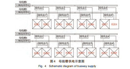 端部饋電模塊由每一列機(jī)柜對應(yīng)的主備供母線槽各裝備 1個接入配電盒,與主干母線槽的插接箱間選用電纜連接。